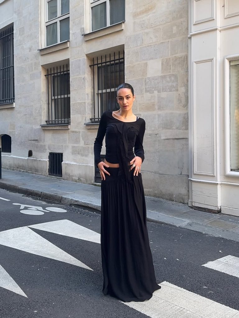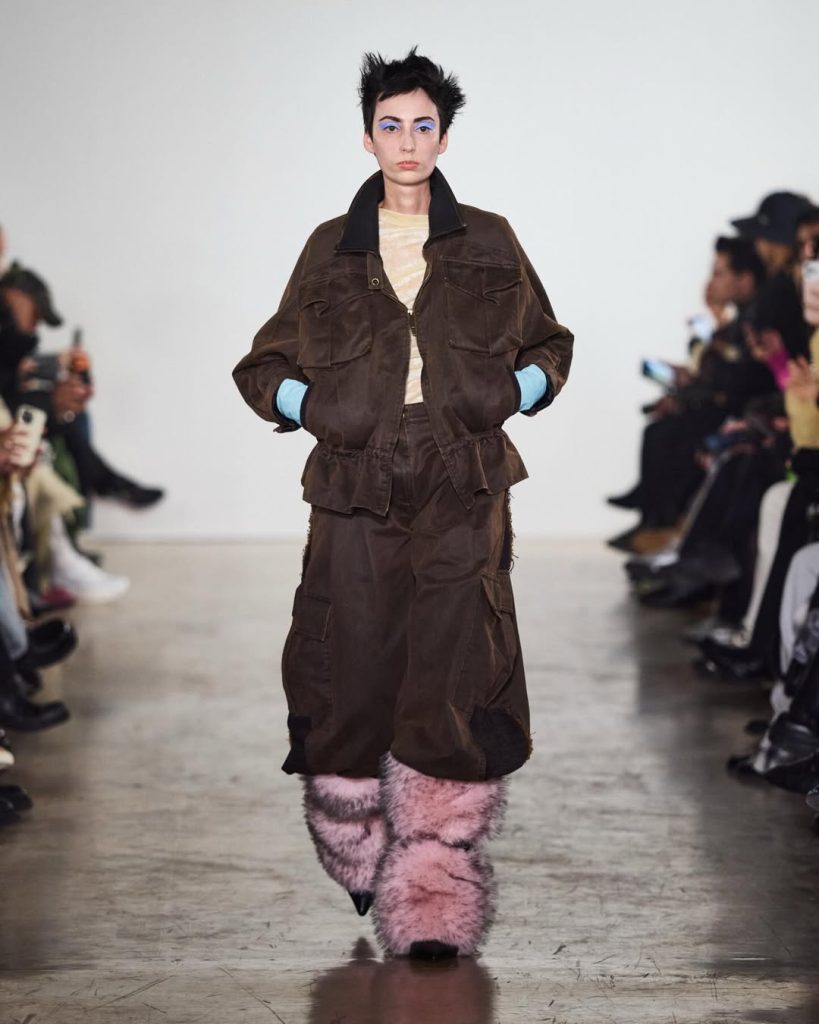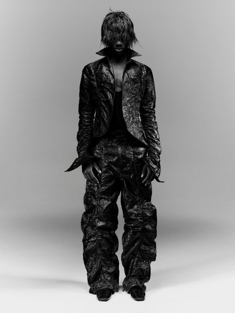 Las siluetas juegan con los contrastes: denimestampado combinado con piel sintética, trajes estructurados suavizados por texturas más orgánicas, seda delicada combinada con materiales técnicos. Cada prenda parece concebida como un punto de encuentro entre dos universos.