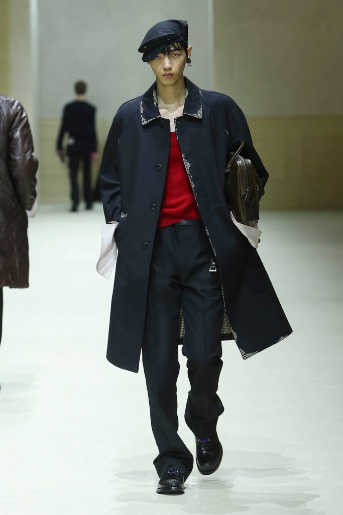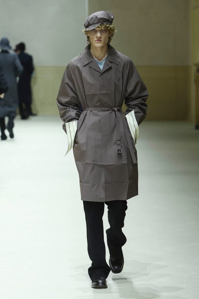 Al contrario que Dolce & Gabbana, Prada ha llevado a cabo una reflexión más serena, casi introspectiva. Bajo el impulso de Miuccia Prada y Raf Simons, la colección presentada en la Fondazione Prada estaba compuesta por siluetas ajustadas, deliberadamente sobrias, solo alteradas por una serie de detalles disonantes: cordones de colores en los botines, mangas de camisas desgastadas, cinturones rotos, trenchs arrugados y gemelos sorprendentes.
