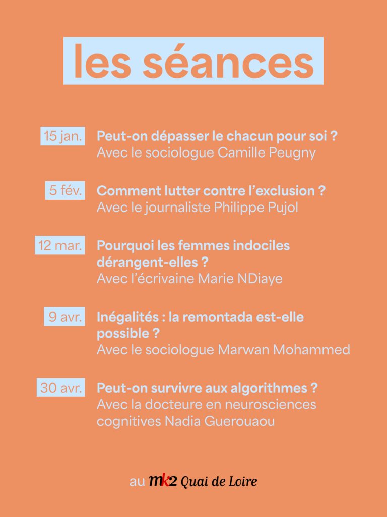 Desde hace varios años, la cadena de cines MK2 se ha convertido en mucho más que un lugar de proyección de películas. A través de sus ciclos de conferencias, con temáticas muy variadas, estos cines parisinos proponen momentos de reflexión colectiva sobre la actualidad cultural y social, como el ciclo «Pensar en nuestra época», presentado actualmente por la periodista Nesrine Slaoui, que ofrece un espacio de diálogo accesible y cercano.